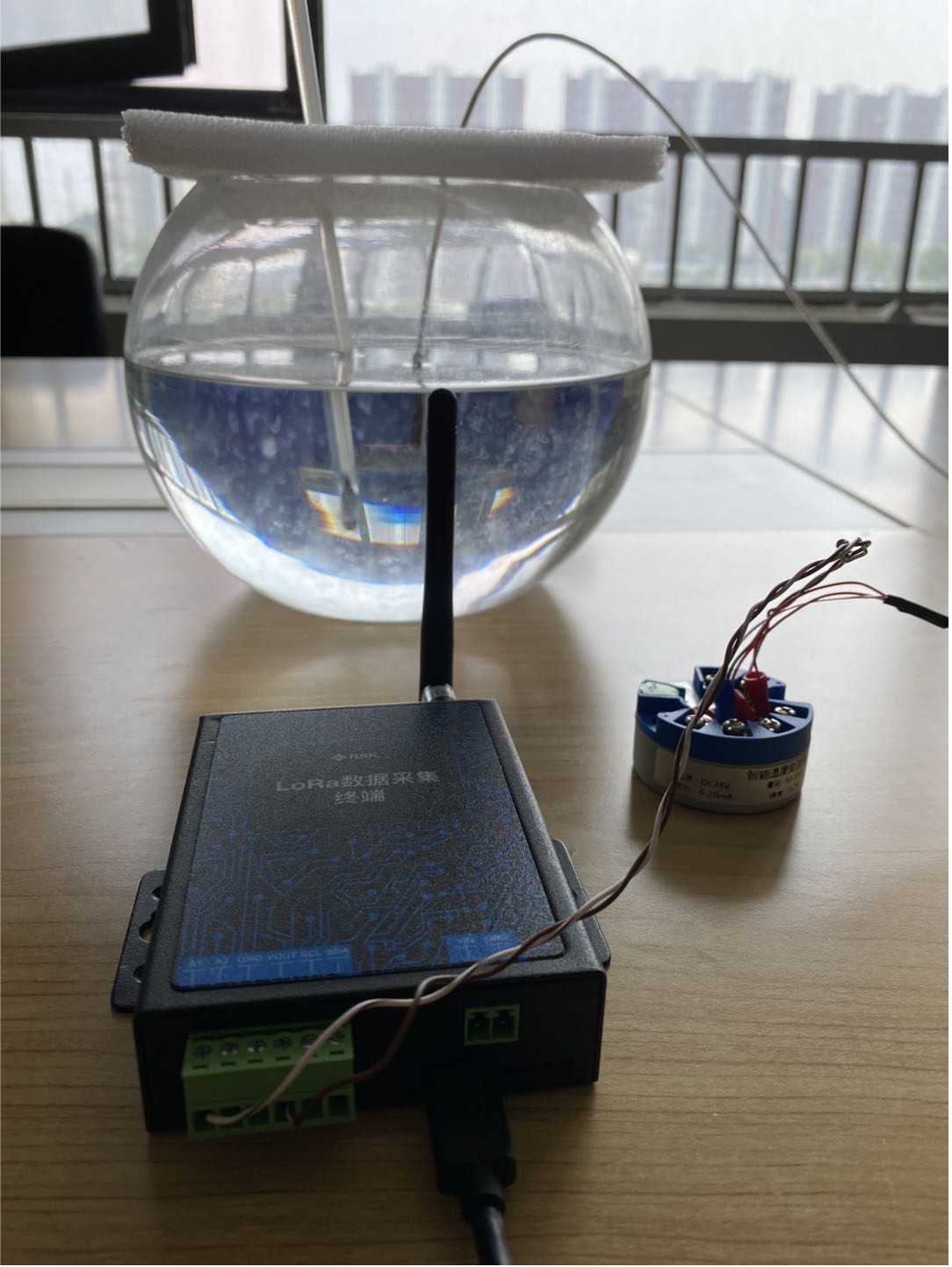将水银温度计和热电阻浸泡在水中,避免空气扰动对读数的影响。将热电阻与温度变送器相连,再连接到RAK瑞科慧联公司的RAK7422/RAK7432。如图一RAK7422/RAK7432(4mA~20mA模拟信号到LoRa数据采集器)所示。