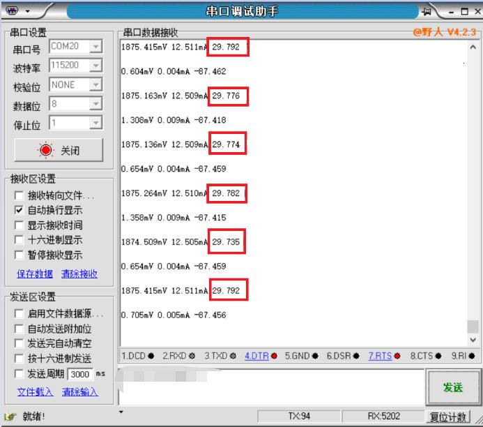 将RAK瑞科慧联RAK7432(4mA~20mA模拟信号到LoRa数据采集器)连接USB串口,通过串口调试工具读出温度为29.73~29.79,如图三串口调试工具所示,与水银温度计测量温度29.7误差小于0.1摄氏度。